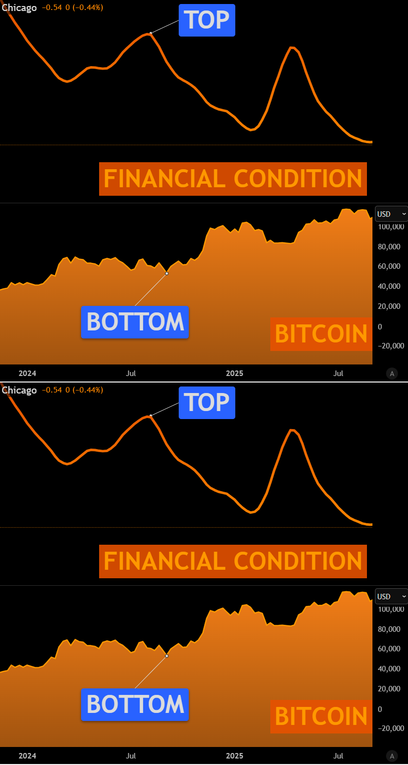 ظهرت هذه الإشارة في أواخر عام 2022 ومنتصف عام 2024، وكلاهما قبل ارتفاعات حادة. تاريخيًا، كان كل انخفاض بمقدار 0.10 نقطة يتماشى مع ارتفاع بنسبة 15% إلى 20% تقريبًا في عملة البيتكوين، مع قراءات NFCI الأعمق تشير إلى مراحل الاتجاه الصعودي الطويلة للبيتكوين.