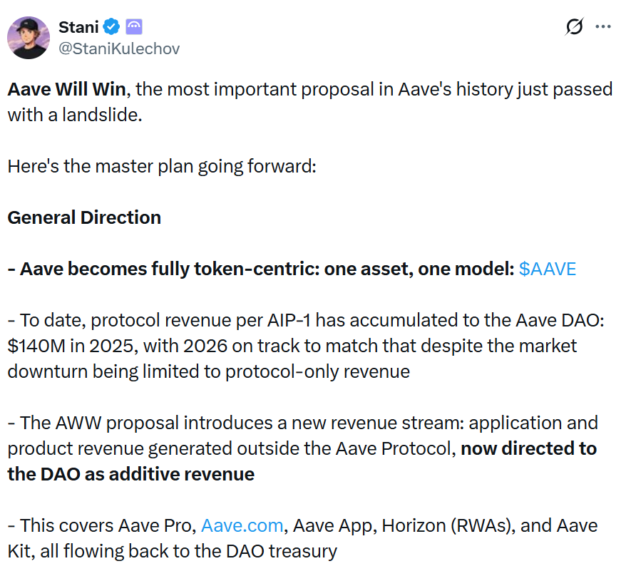 بعد التصويت، قال مؤسس Aave ستاني كوليتشوف في منشور X يوم السبت إن Aave Will Win هو “الاقتراح الأكثر أهمية في تاريخ Aave” وقد “تم تمريره للتو بأغلبية ساحقة”.