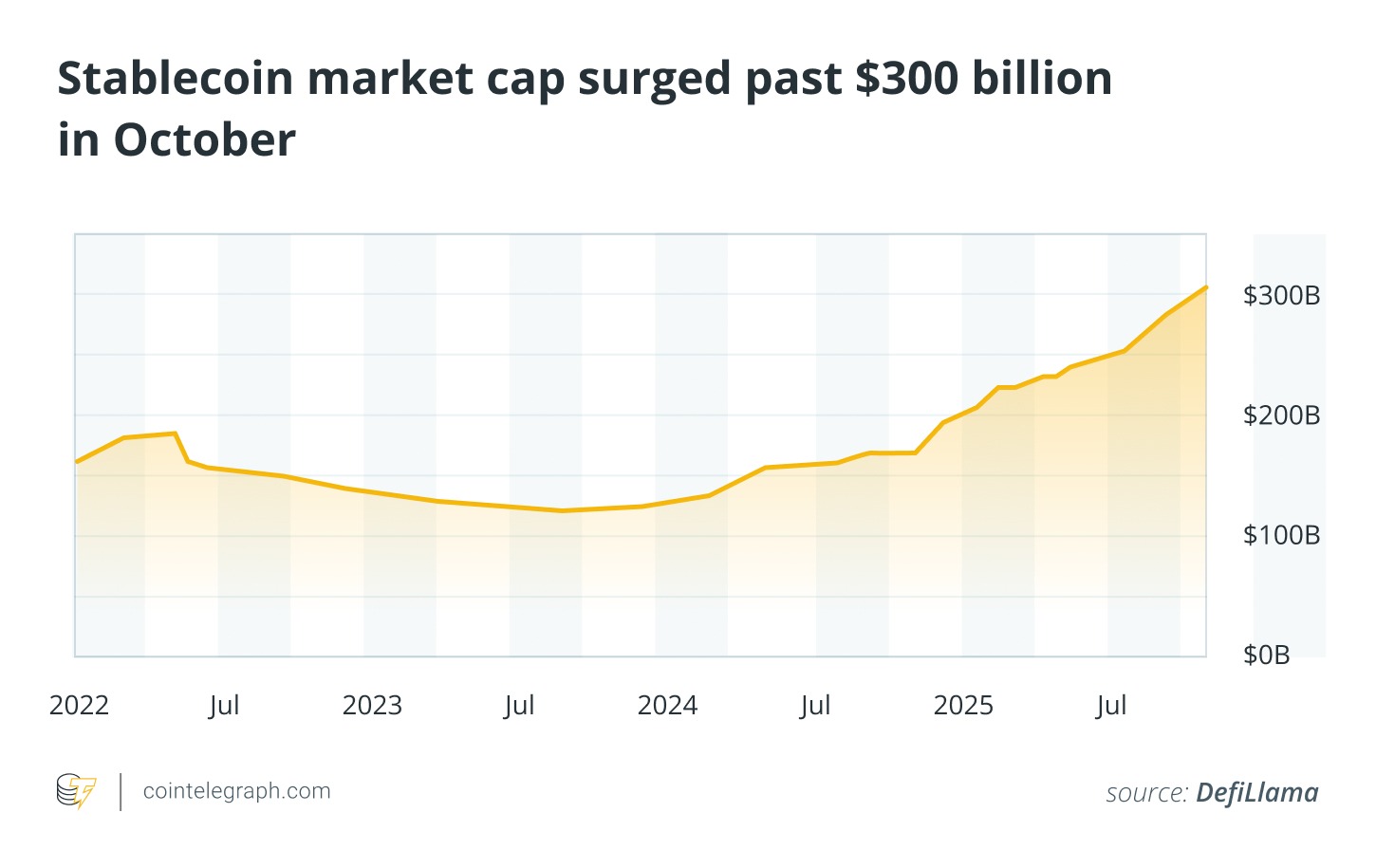 وفي الوقت نفسه، يستمر اعتماد العملات المستقرة في النمو. تجاوز إجمالي القيمة السوقية لسوق العملات المستقرة 300 مليار دولار لأول مرة في أكتوبر.