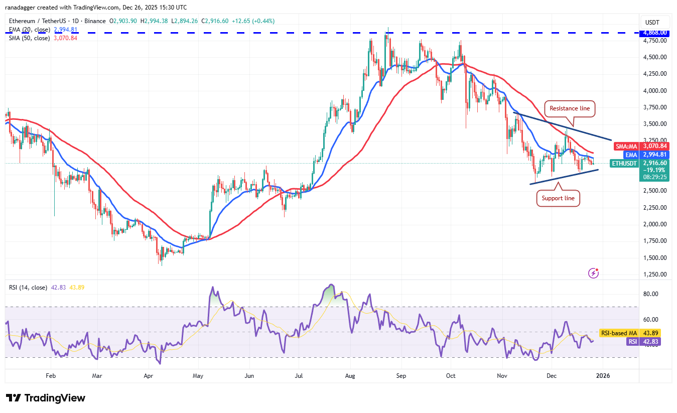 يستمر تداول إيثريوم (ETH) داخل نمط المثلث المتماثل، مما يشير إلى التوازن بين العرض والطلب.