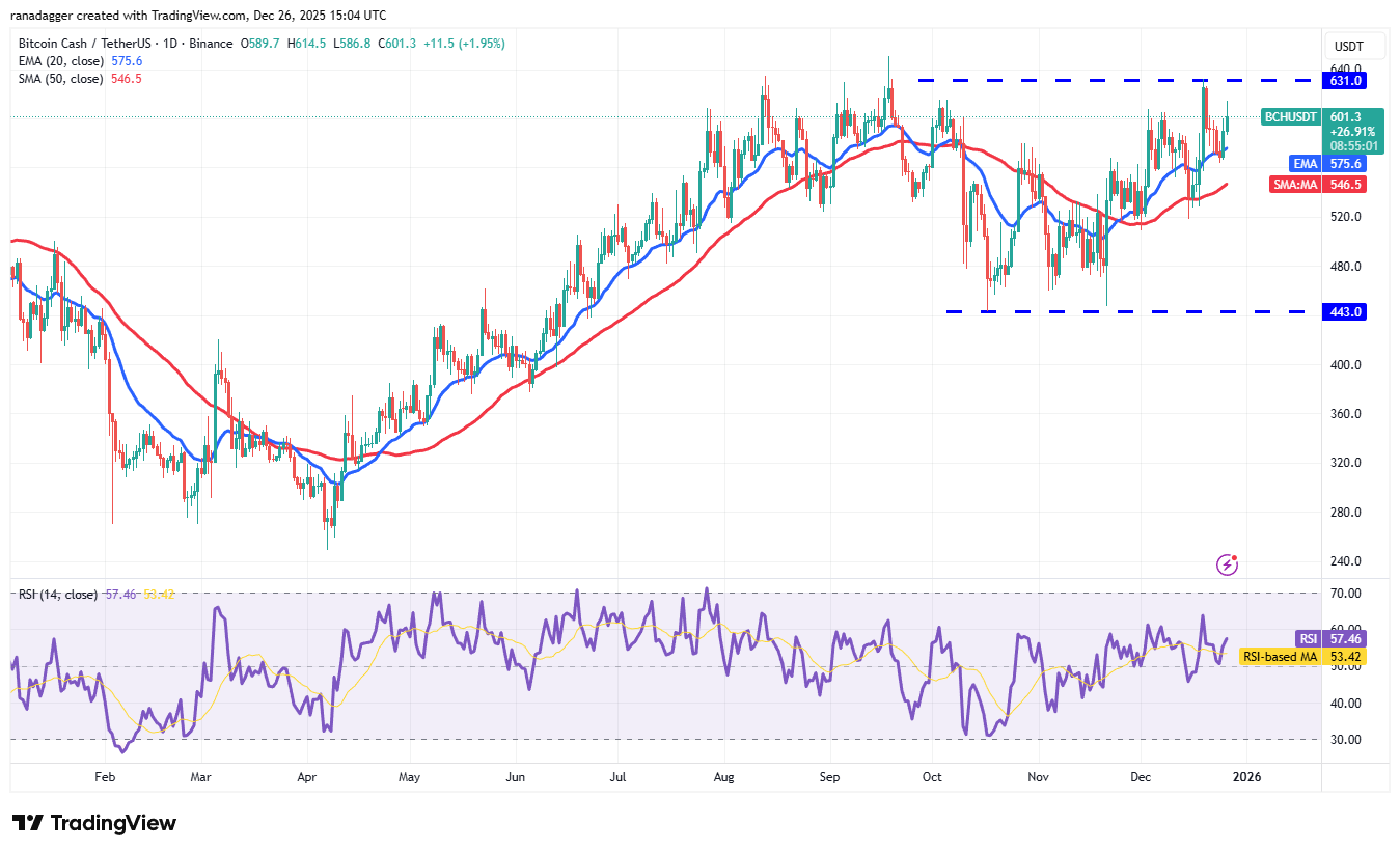 ارتفعت عملة البيتكوين كاش (BCH) من المتوسط المتحرك الأسي لمدة 20 يومًا (575 دولارًا) يوم الخميس، مما يشير إلى معنويات إيجابية.