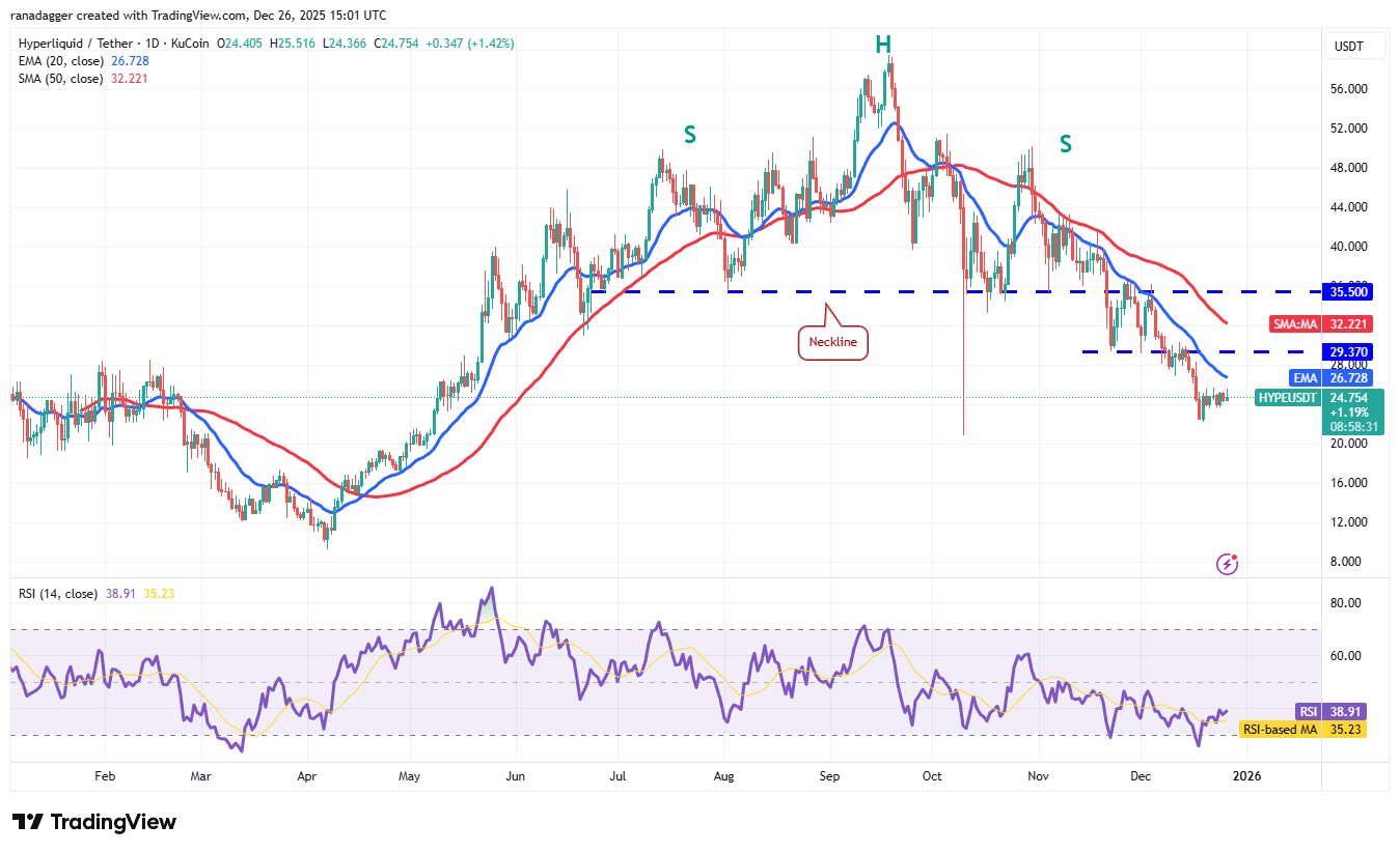 لا يزال Hyperliquid (HYPE) أدنى من المتوسط المتحرك الأسي على مدى ٢٠ يومًا (٢٦,٧٢ دولارًا)، لكن المضاربين على الانخفاض فشلوا في خفض السعر إلى ما دون مستوى الدعم البالغ ٢٢,١٩ دولارًا.