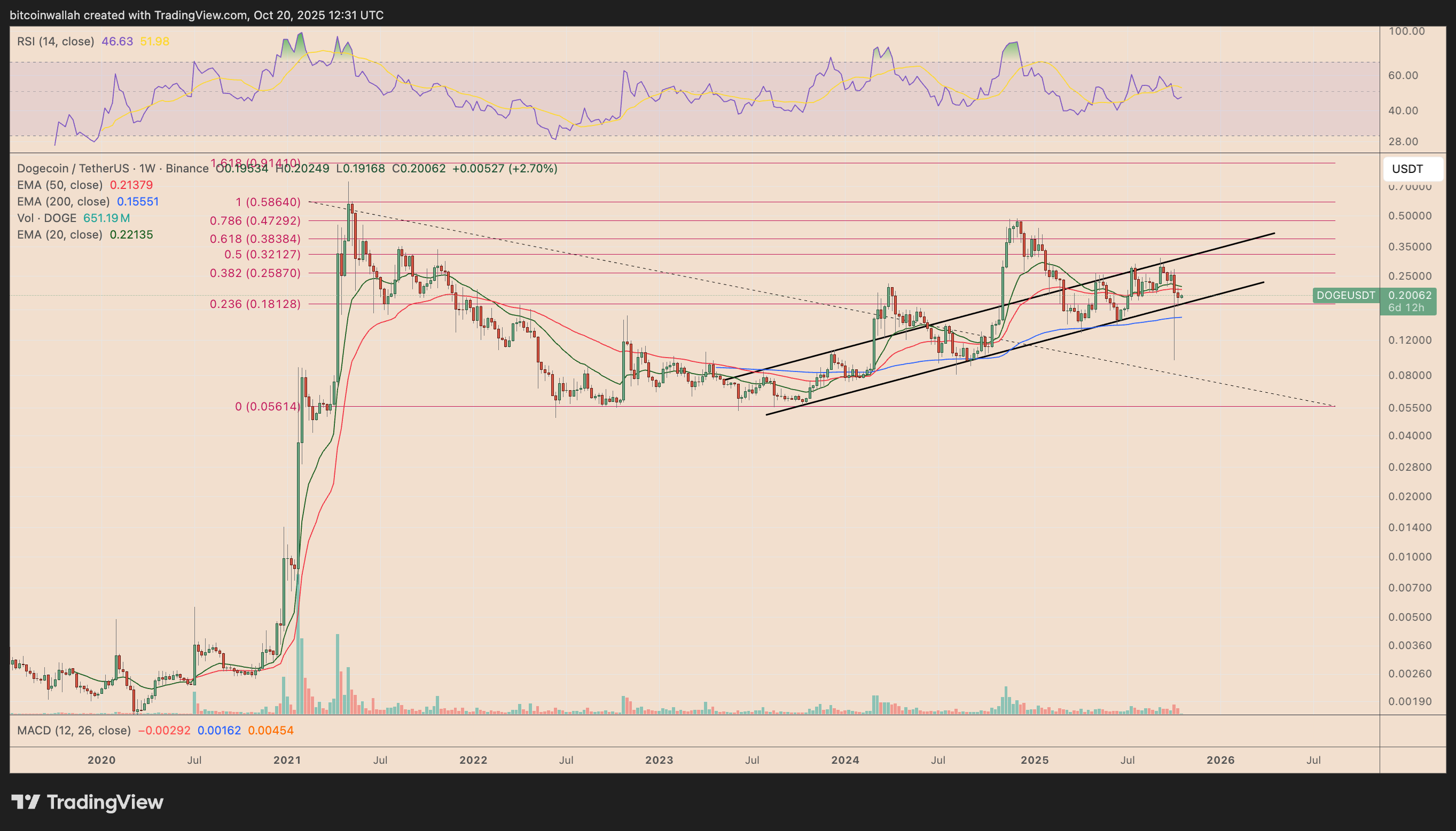 يتماشى الهدف مع توقعات الحركة المقاسة للنموذج ويتزامن مع منطقة التقاء فنية رئيسية. كما أنه يتطابق أيضًا مع مستوى تصحيح فيبوناتشي 0.382 على الرسم البياني الأسبوعي لـ DOGE، كما هو موضح أدناه.