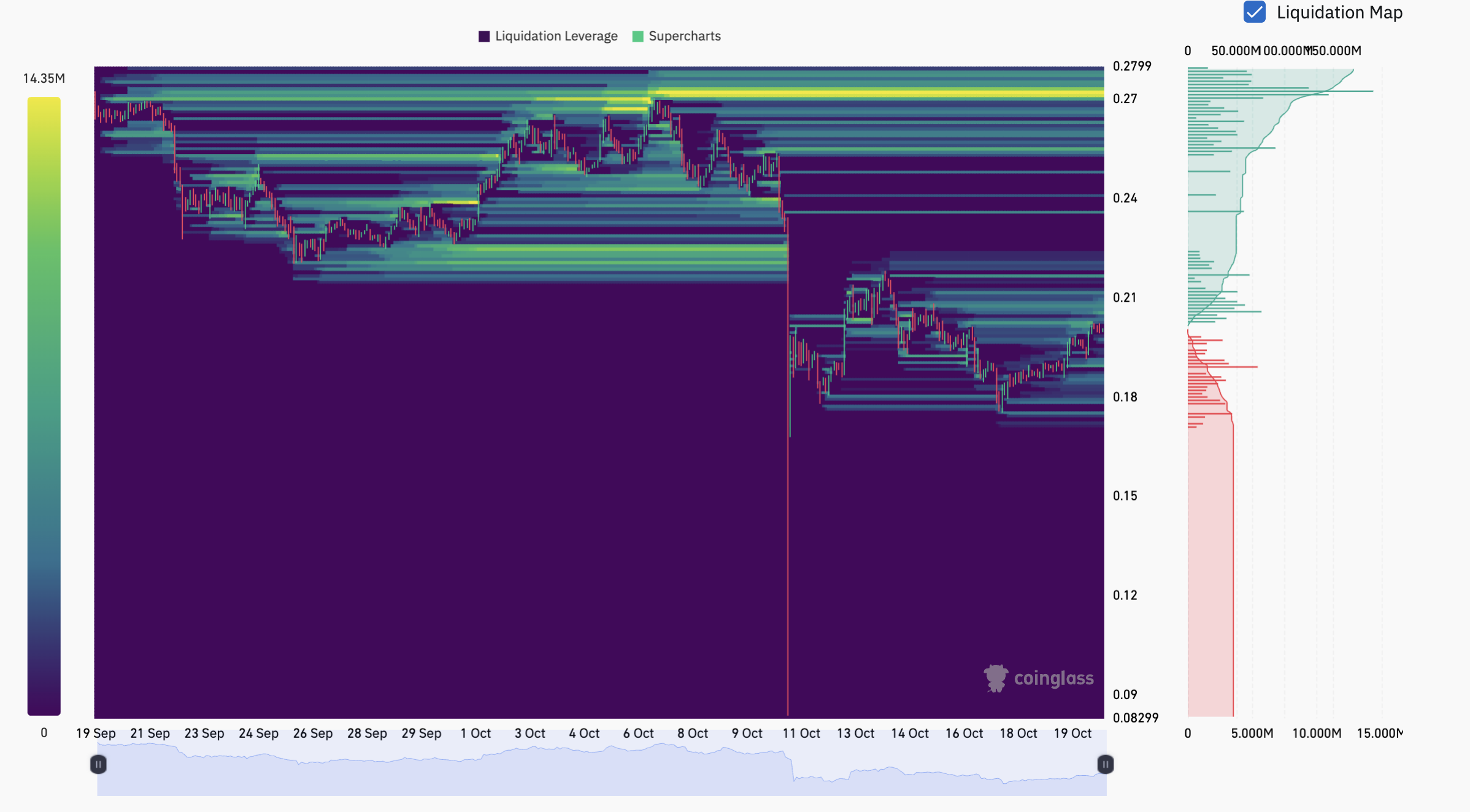 تُظهر بيانات العقود الآجلة تركيزًا أكبر للتصفية على المكشوف بين 0.215 دولار و0.27 دولار، في حين تظل مستويات التصفية على المدى الطويل ثابتة نسبيًا أقل من 0.18 دولار.