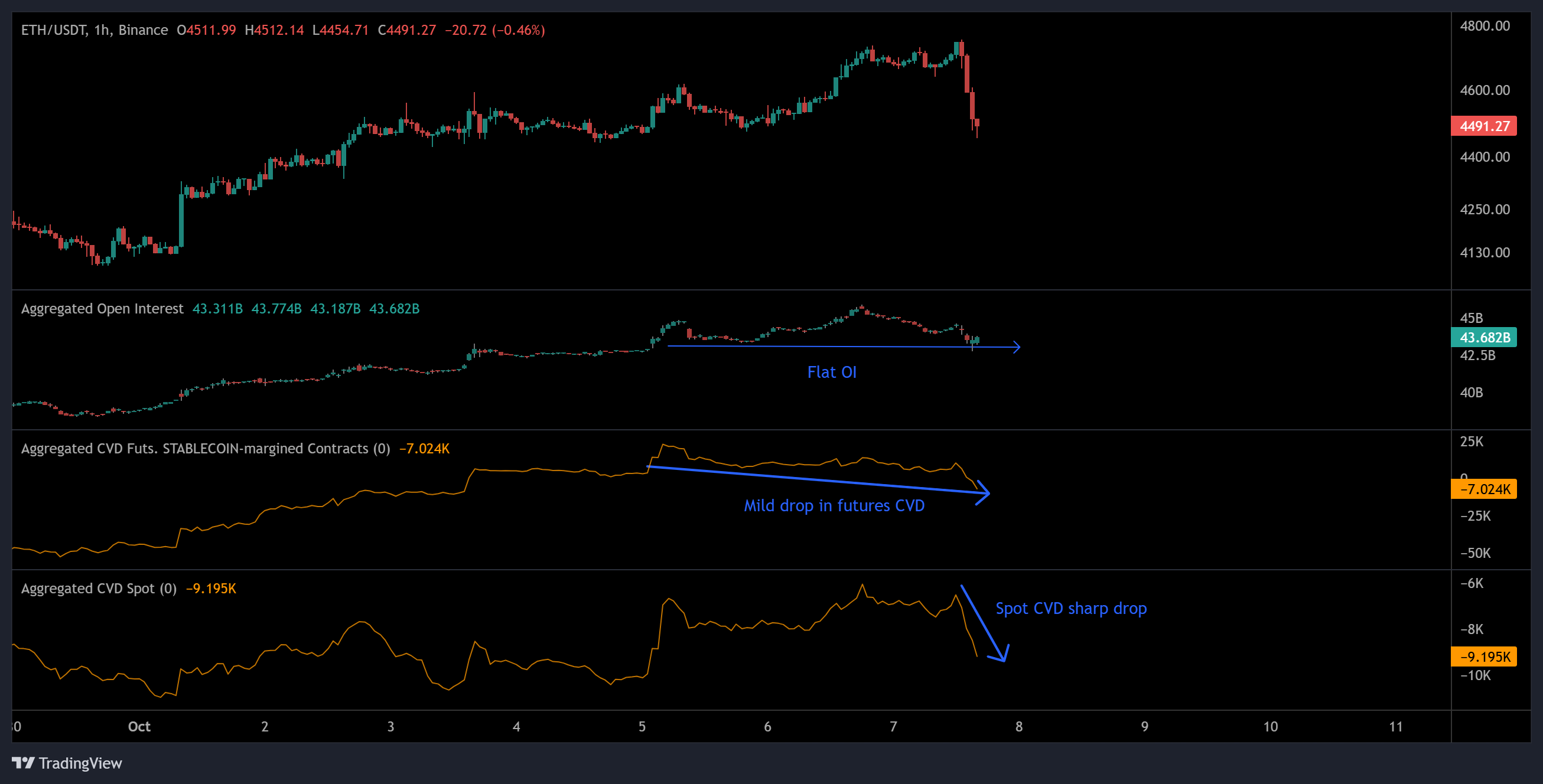أعادت ETH اختبار مستوى 4500 دولار، حيث أظهرت بيانات onchain والمشتقات إشارات متضاربة. في حين انخفض دلتا الحجم التراكمي الفوري (CVD) بشكل حاد، مما يشير إلى ضغط البيع الصافي في السوق الفورية، ظلت عقود الفائدة المفتوحة والعقود الآجلة CVD مرتفعة. يشير هذا إلى أن المتداولين ذوي الرافعة المالية ما زالوا نشطين ويتخذون مراكز للتقلبات، حتى مع قيام المشترين الفوريين بجني الأرباح.