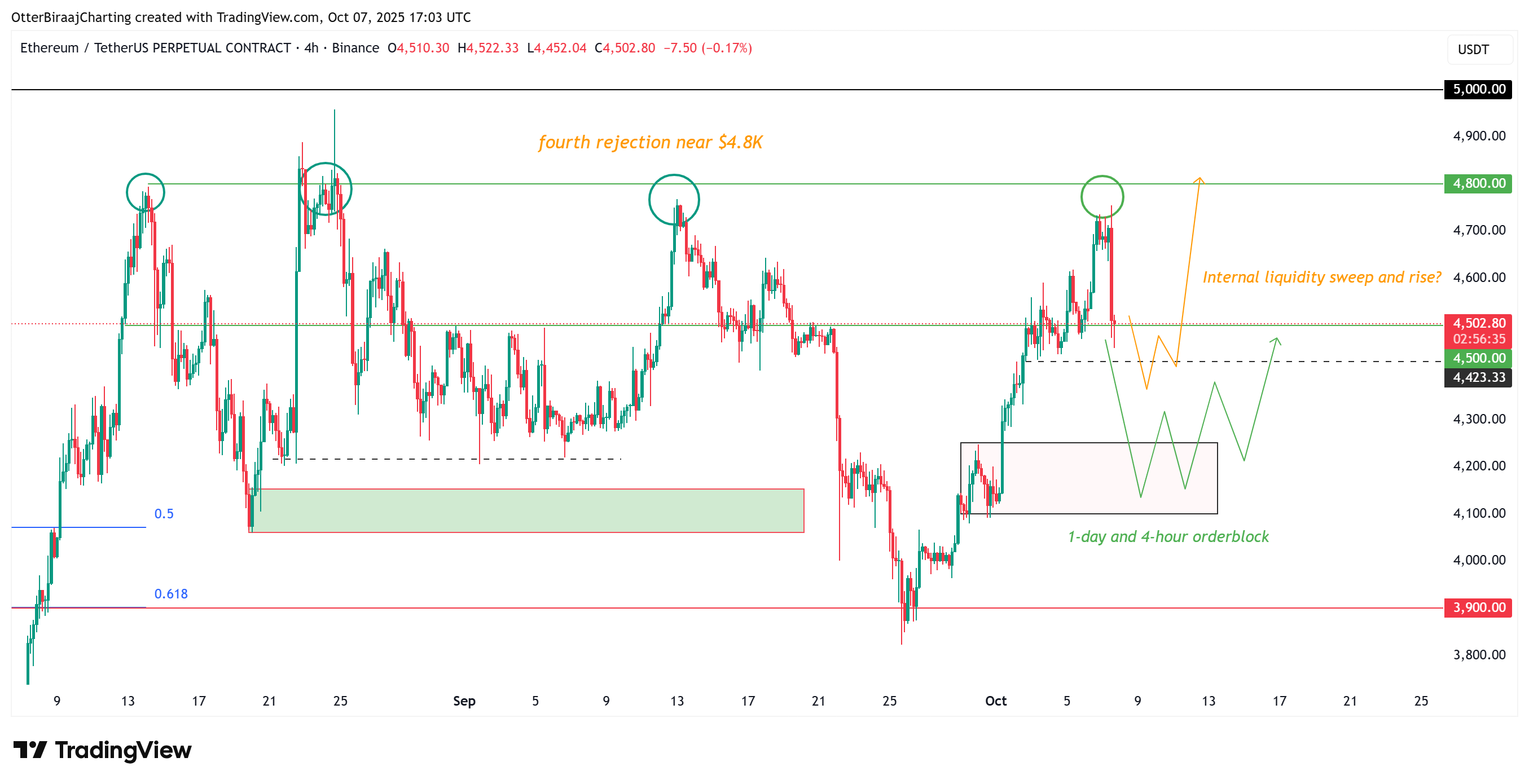 فشل Ethereum في كسر مستوى 4800 دولار، مع تباعد هبوطي أدى إلى تصحيح بنسبة 3٪.