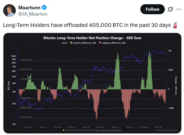 تُظهر البيانات من CryptoQuant أيضًا أن حاملي العملات على المدى الطويل قاموا بتفريغ 405000 بيتكوين في الفترة من 2 أكتوبر إلى 2 نوفمبر تقريبًا.