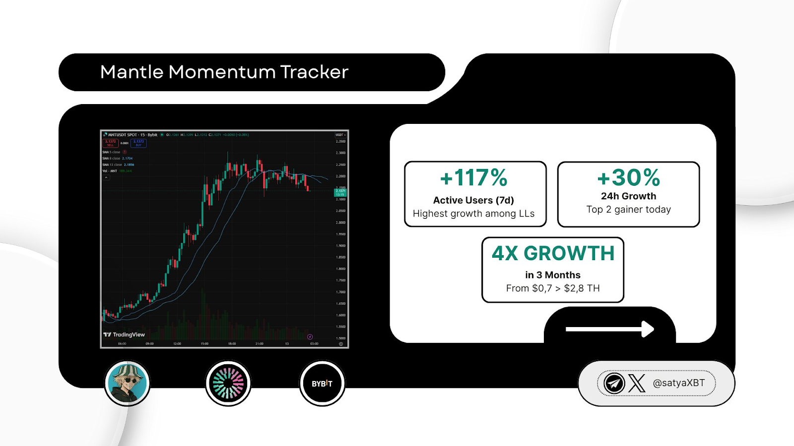 ارتفعت عناوين Mantle النشطة بنسبة 117% أسبوعيًا، مما يمثل “أقوى نمو بين جميع عناوين L2″، وفقًا لمحقق blockchain SatyaXBT.