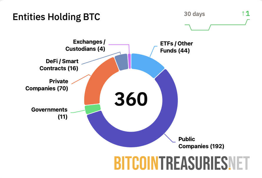وفقًا لبيانات من موقع BitcoinTreasuries.NET، فإن 192 شركة متداولة علنًا تحتفظ الآن بالبيتكوين في ميزانياتها العمومية، وهو ما يمثل مجتمعة ما يقرب من 1.1 مليون بيتكوين.