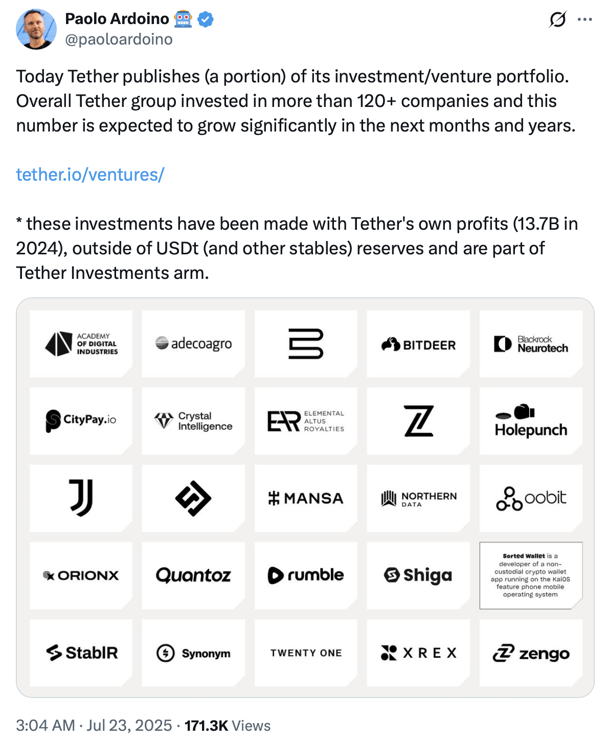 قال الرئيس التنفيذي باولو أردوينو في يوليو إن شركة Tether استثمرت في أكثر من 120 شركة من خلال ذراعها الاستثماري، مع تمويل تلك الاستثمارات من أرباح الشركة بدلاً من احتياطيات العملات المستقرة.