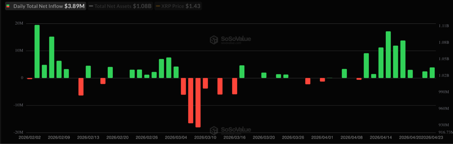 يشير هذا إلى زيادة الشهية المؤسسية لمنتجات XRP، على الرغم من انخفاض السعر بنسبة 22٪ في عام 2026 وتأخره مقابل البيتكوين.