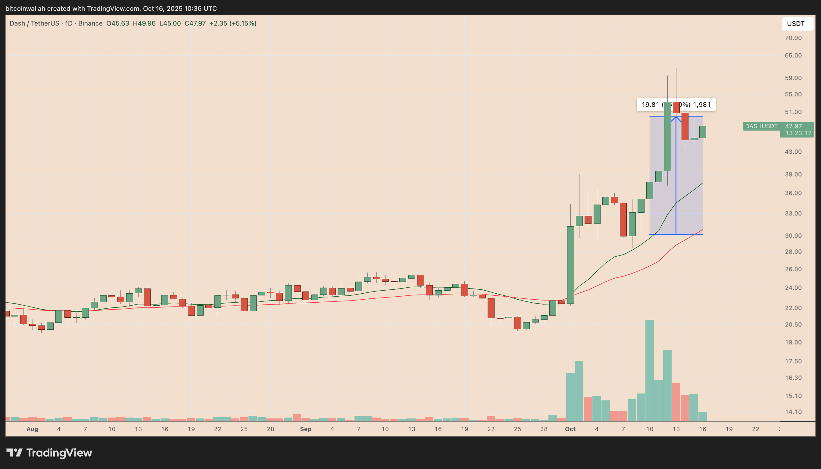 انتعشت عملة DASH بأكثر من 65% منذ الانهيار الذي حدث في 9 أكتوبر، وتم تداولها بحوالي 50 دولارًا اعتبارًا من يوم الخميس. وفي الوقت نفسه، كانت عوائدها في الشهر الماضي قريبة من 150٪.