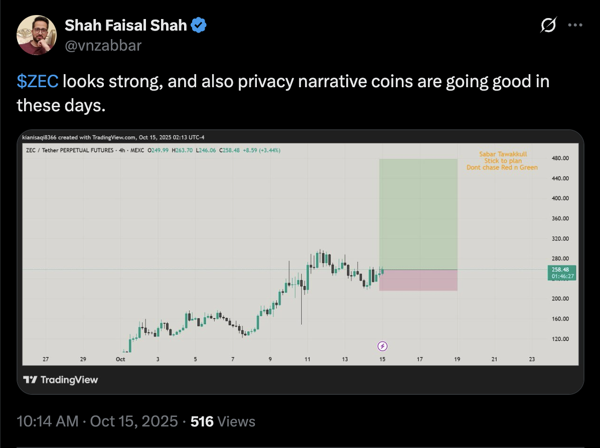 بدأت عملات الخصوصية في الارتفاع بعد أن وصف المستثمر الشهير نافال رافيكانت Zcash بأنها “تأمين ضد بيتكوين” في منشور بتاريخ الأول من أكتوبر، حيث قفزت ZEC بأكثر من 60٪ خلال اليوم.
