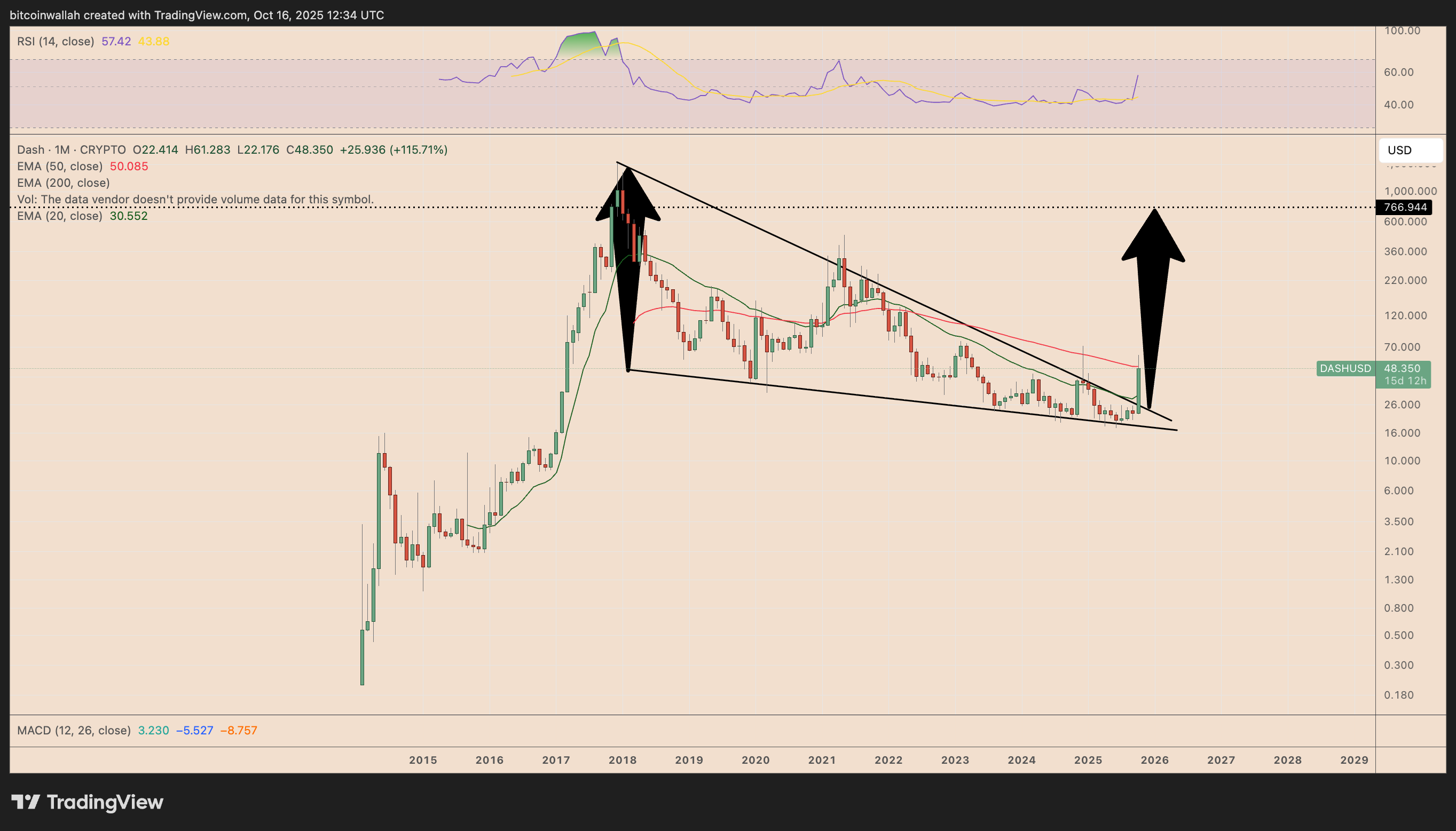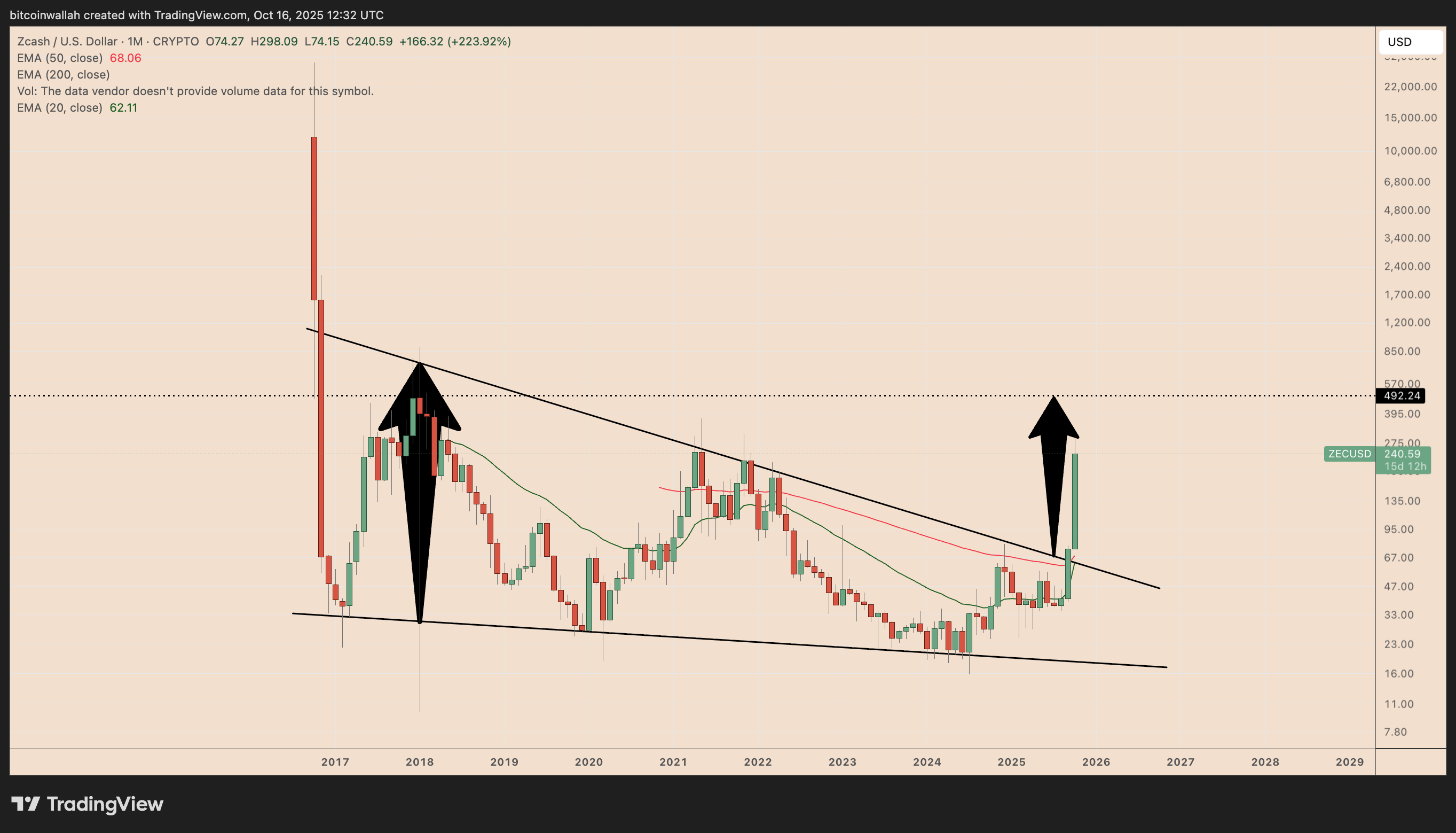 لقد كسر كل من Zcash وDash أنماط الوتد الهابط لعدة سنوات، وهو إعداد انعكاس صعودي يسبق غالبًا استمرار الاتجاه الصعودي القوي.