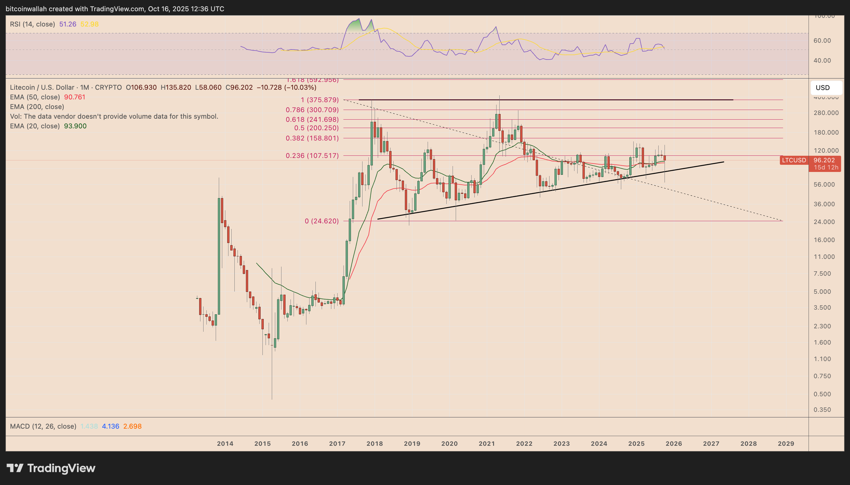 يظل LTC داخل نمط المثلث الصاعد، المحدد بسلسلة من القيعان الأعلى منذ عام 2022.