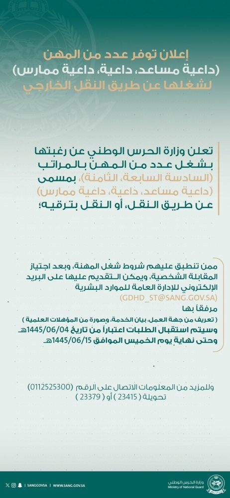 أعلنت وزارة الحرس الوطني رغبتها بشغل عدد من المهن الشاغرة على سلم أعضاء هيئة التدريس بمسمى (أستاذ مساعد، محاضر) وعدد من المهن الشاغرة بالمراتب (السادسة، السابعة، الثامنة) بمسمى (داعية مساعد، داعية، داعية ممارس).