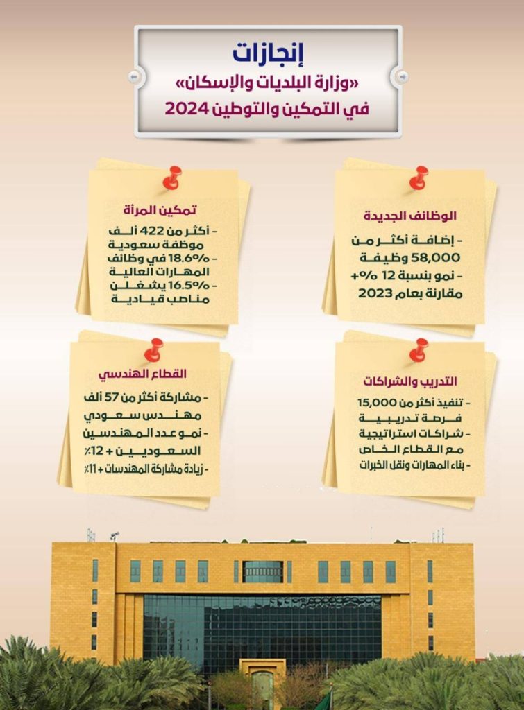 عملت وزارة البلديات والإسكان خلال عام 2024 على المساهمة في إحداث قفزة نوعية في تنمية القدرات البشرية والتوطين في الأنشطة الاقتصادية والمهن التي تشرف عليها الوزارة، مع تسجيل إنجازات بارزة في تمكين المرأة وتعزيز الشراكات الفاعلة، إلى جانب نمو لافت في القطاع الهندسي. وتأتي هذه الإنجازات ضمن جهود الوزارة لترسيخ وجود السعوديين في القطاع البلدي والإسكان وتعزيز الاقتصاد القائم على الكفاءات الوطنية.