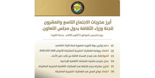 علمت “الأنباء” من مصادر أن الاجتماع الـ 29 للجنة وزراء الثقافة بدول مجلس التعاون الخليجي، والمنعقد في الكويت يوم الخميس 9 أكتوبر، قد انتهى إلى 6 توصيات، هي: