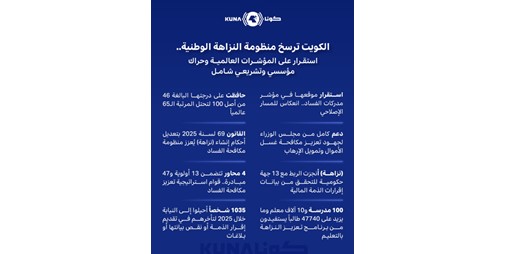 ويمثل استقرار موقع البلاد في مؤشر مدركات الفساد العالمي (CPI) لعام 2025 انعكاسا مباشرا للمسار الإصلاحي، إذ حافظت الكويت على درجتها البالغة 46 من أصل 100 محتلة المرتبة 65 عالميا من بين 182 دولة وإقليما، مؤكدة صمود منظومتها الرقابية في وجه التراجعات التي شهدها المتوسط العالمي.