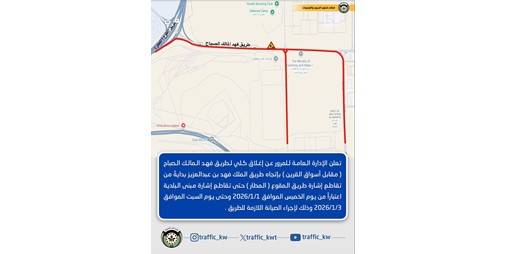 أعلنت الإدارة العامة للمرور عن إغلاق كلي لطريق فهد المالك الصباح (مقابل أسواق القرين) باتجاه طريق الملك فهد بن عبدالعزيز بدايةً من تقاطع إشارة طريق المقوع (المطار) حتى تقاطع إشارة مبنى البلدية، اعتبارا من يوم الخميس الموافق 2026/1/1 وحتى يوم السبت الموافق 2026/1/3 وذلك لإجراء الصيانة اللازمة للطريق.