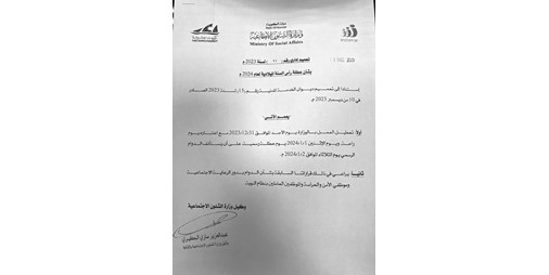أصدر وكيل وزارة الشؤون الاجتماعية بالإنابة عبدالعزيز المطيري تعميما للموظفين، استنادا إلى تعميم ديوان الخدمة المدنية رقم (15) لسنة 2023 الصادر في 10 من ديسمبر 2023 م بموجبه يعطل العمل بالوزارة الأحد الجاري مع اعتباره يوم راحة، ويوم الاثنين 2024/1/1 يوم عطلة رسمية، على أن يستأنف الدوام الرسمي يوم الثلاثاء 2024/1/2.