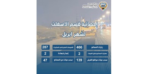 كشفت إحصائية صادرة عن وزارة الأشغال العامة أن قسم الأسفلت وفرق الطوارئ واصلت عملها بكثافة خلال شهر أبريل 2025، حيث تم تنفيذ 466 زيارة ميدانية لمصانع الأسفلت، إلى جانب 139 عملية سحب عينات من مواقع الفرش، و47 عينة سحبت من المصانع، بينما أنجزت المختبرات 287 فحصا فنيا، وأصدرت شهادتان خلال الشهر نفسه، مع إجراء معايرتين وتحليل فجوتين.