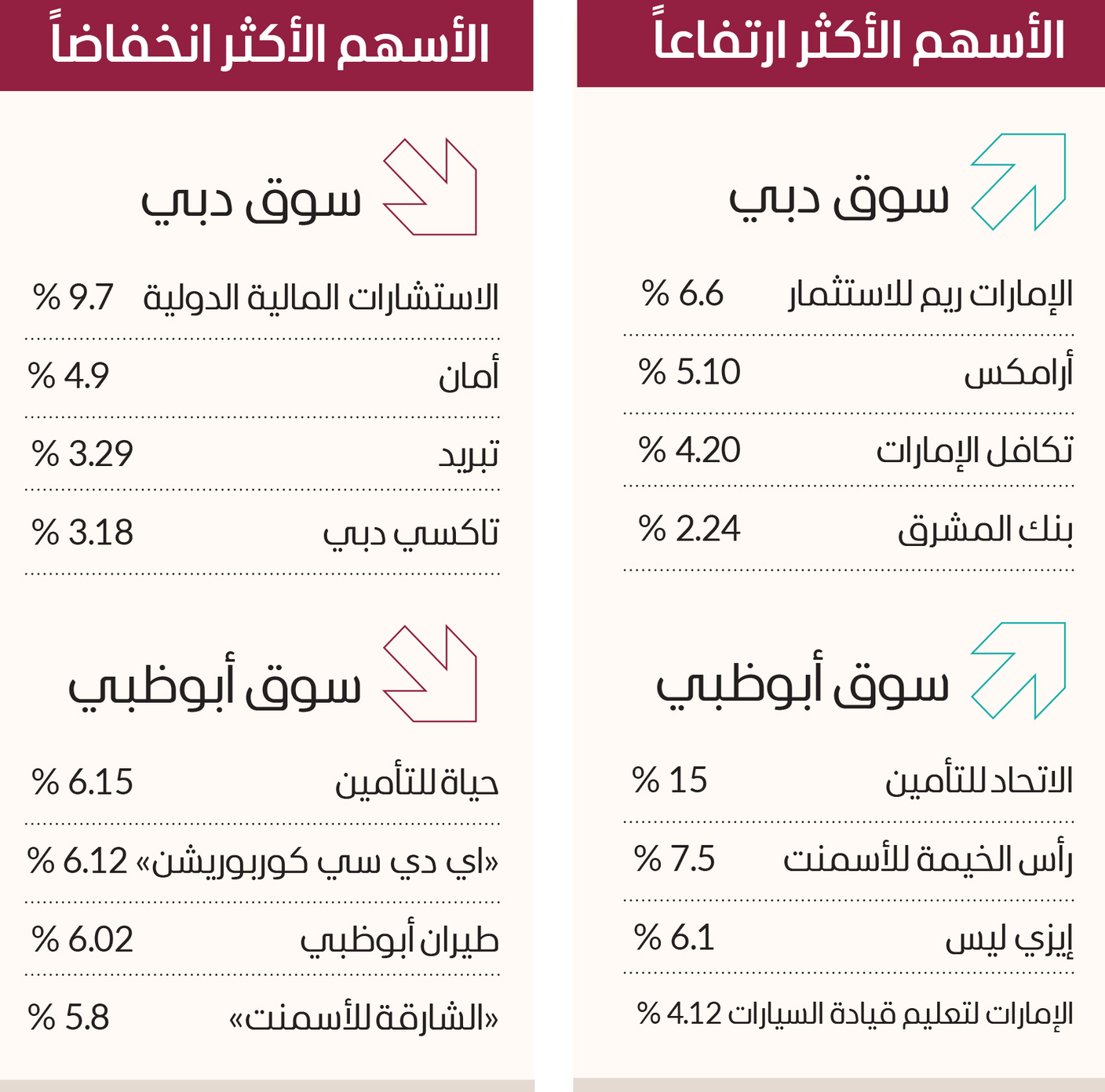 وحقق سهم «الإمارات ريم للاستثمار»، صدارة ارتفاعات سوق دبي المالي، بنمو 6.6%، تلاه سهم «أرامكس» بنسبة 5.10%، فيما زاد سهم «تكافل الإمارات» بنسبة 4.20%، وسهم «بنك المشرق» 2.4%، سهم بنك دبي التجاري بنسبة 2.06%، بينما تراجع سعر سهم شركة «الاستشارات المالية» 9.7%، و«أمان» أيضاً بنسبة 4.9%، ثم سهم «تبريد» بنسبة 3.2%، تلاهم سهم «تاكسي دبي» بنسبة بلغت 3.18%، و«ديوا» 2.7%.