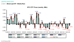 حافظت منتجات الاستثمار في العملات المشفرة على زخمها التصاعدي الأسبوع الماضي، حيث سجلت مكاسب لأسبوعين متتاليين بعد التدفقات الخارجية الكبيرة.اجتذبت منتجات العملات المشفرة المتداولة في البورصة (ETPs) تدفقات بقيمة 716 مليون دولار، مما أضاف إلى مكاسب الأسبوع السابق البالغة مليار دولار، حسبما أفاد مدير أصول العملات المشفرة الأوروبي CoinShares يوم الاثنين.وقال جيمس باترفيل، رئيس الأبحاث في CoinShares، في التحديث: “سلطت البيانات اليومية الضوء على تدفقات خارجية طفيفة يومي الخميس والجمعة فيما نعتقد أنه استجابة لبيانات الاقتصاد الكلي في الولايات المتحدة التي تشير إلى الضغوط التضخمية المستمرة”.ودفعت التدفقات الجديدة إجمالي الأصول الخاضعة للإدارة (AUM) إلى ما يزيد عن 180 مليار دولار،…