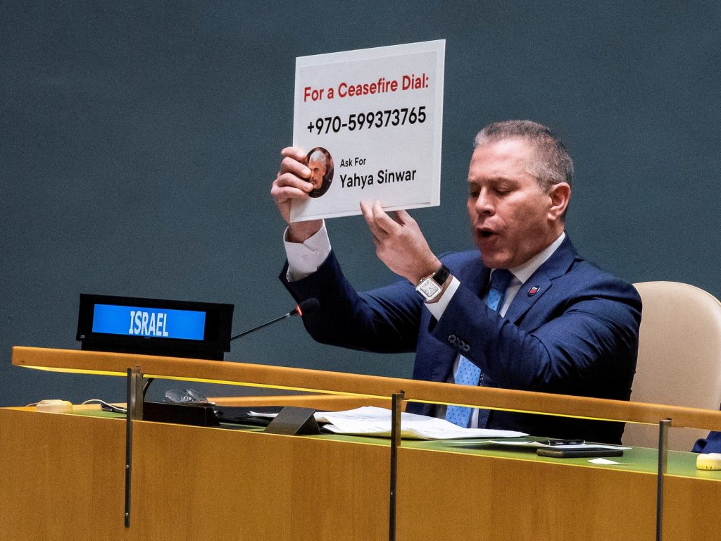 لوح سفير إسرائيل لدى الأمم المتحدة، جلعاد أردان، خلال مناقشة الجمعية العامة للأمم المتحدة دعوة لوقف إطلاق النار في غزة، بصورة زعيم حركة المقاومة الإسلامية (حماس) يحيى السنوار مرفقة برقم اعتقد أنه لهاتفه الشخصي، قائلا إنه هو من بيده وقف الحرب، في حين تبين أن الرقم يعود إلى مركز الاتصال الحكومي في غزة.