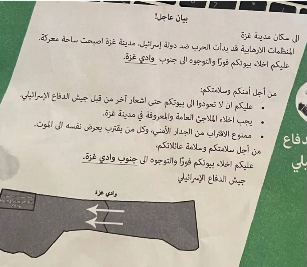 يذكر أن إخلاء شمال غزة يعني نقل نحو نصف سكان القطاع البالغ عددهم قرابة 2.2 إلى منطقة الجنوب المكتظة أساساً بالسكان، وسط حصار مطبق نفذ منذ الاثنين الماضي على غزة.