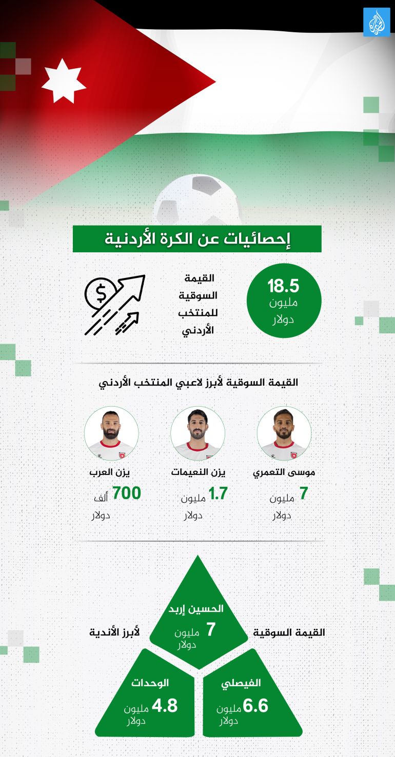 بحسب موقع “ترانسفيرماركت” (Transfermarkt) الألماني المتخصص في القيم السوقية واقتصاد كرة القدم، فإن القيمة السوقية للمنتخب الأردني كله لا تتجاوز 18.5 مليون دولار، وهي قيمة متواضعة مقارنة بمنتخبات آسيوية تأهلت أيضا إلى كأس العالم بل أقل من قيمة لاعب واحد من المغمورين في الدوريات الكبرى.