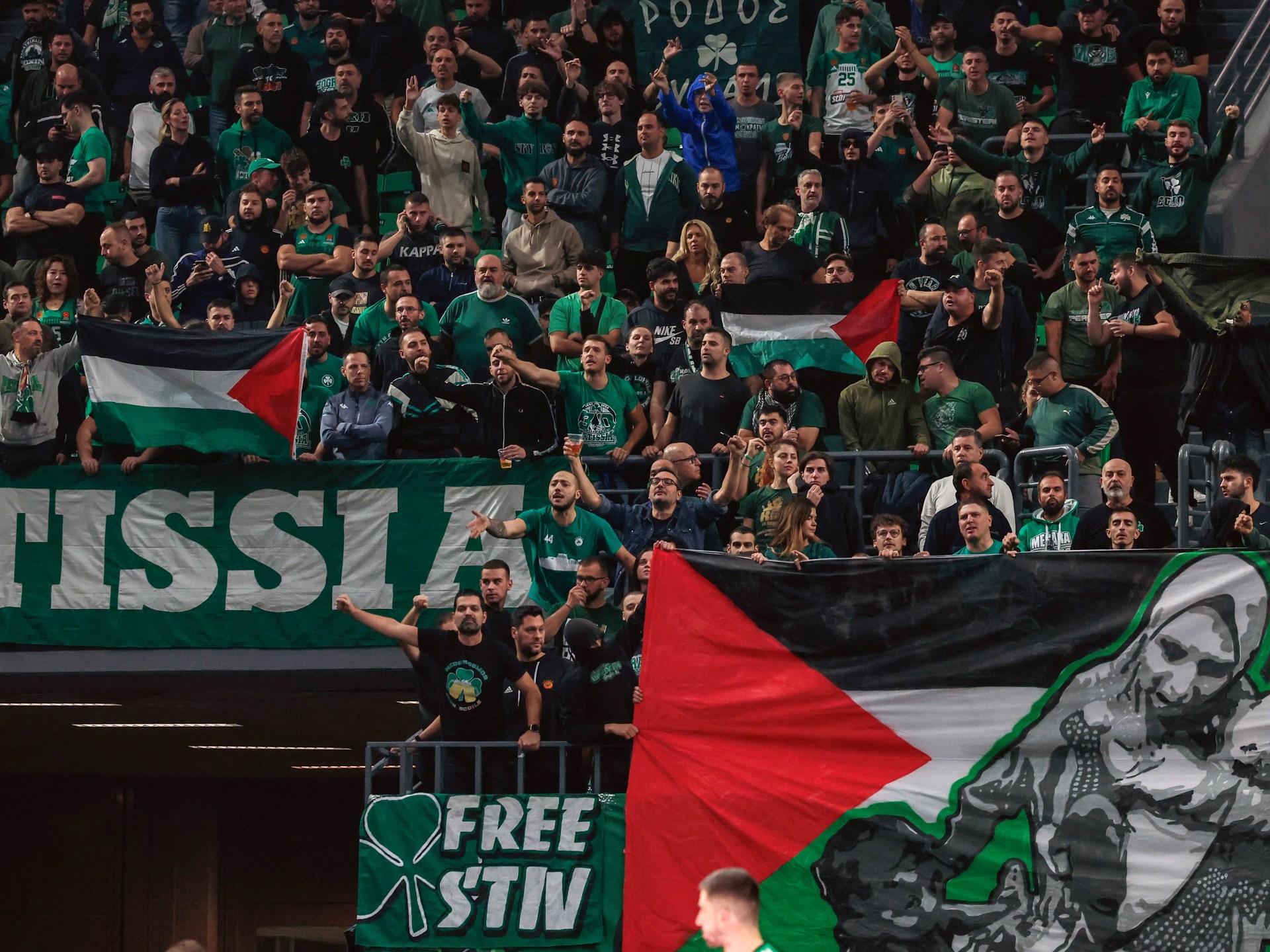 ندد مشجعو فريق باناثينايكوس اليوناني بالحرب الإسرائيلية المتواصلة على قطاع غزة منذ أكثر من 13 شهرا وبالممارسات الإسرائيلية بحق الشعب الفلسطيني على وجه العموم.