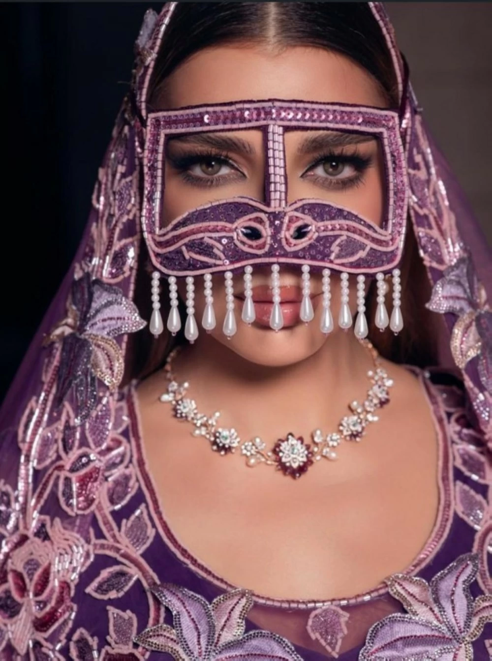 العنصر الأبرز كان غطاء الوجه المستوحى من البرقع التقليدي، والمطرّز بعناية مع خيوط متدلّية أضافت بعدًا احتفاليًا ودراميًا، في إشارة ذكية إلى الجذور الثقافية الخليجية بأسلوب مُحدّث. الطرحة الشفافة المنسدلة أكملت المشهد، ومنحت الحركة خفة تُخفف من كثافة التطريز، بينما حافظت على وقار الإطلالة.