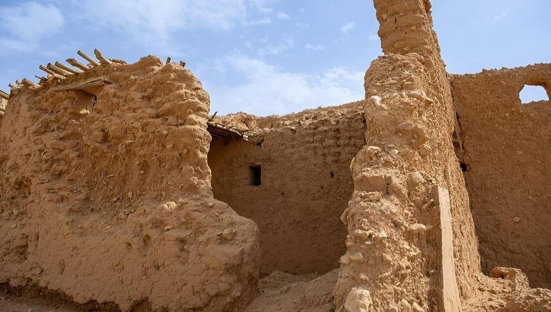 وتحتضن القرية أطلال بيوت طينية وقصورًا أثرية يتجاوز عمر بعضها مئة عام، لا تزال بقاياها قائمة حتى اليوم شاهدةً على حقب تاريخية متتابعة، وعلى أنماط معيشية ارتبطت بالمكان بوصفه محطة استقرار ومورد ماء رئيسًا في بيئة صحراوية.