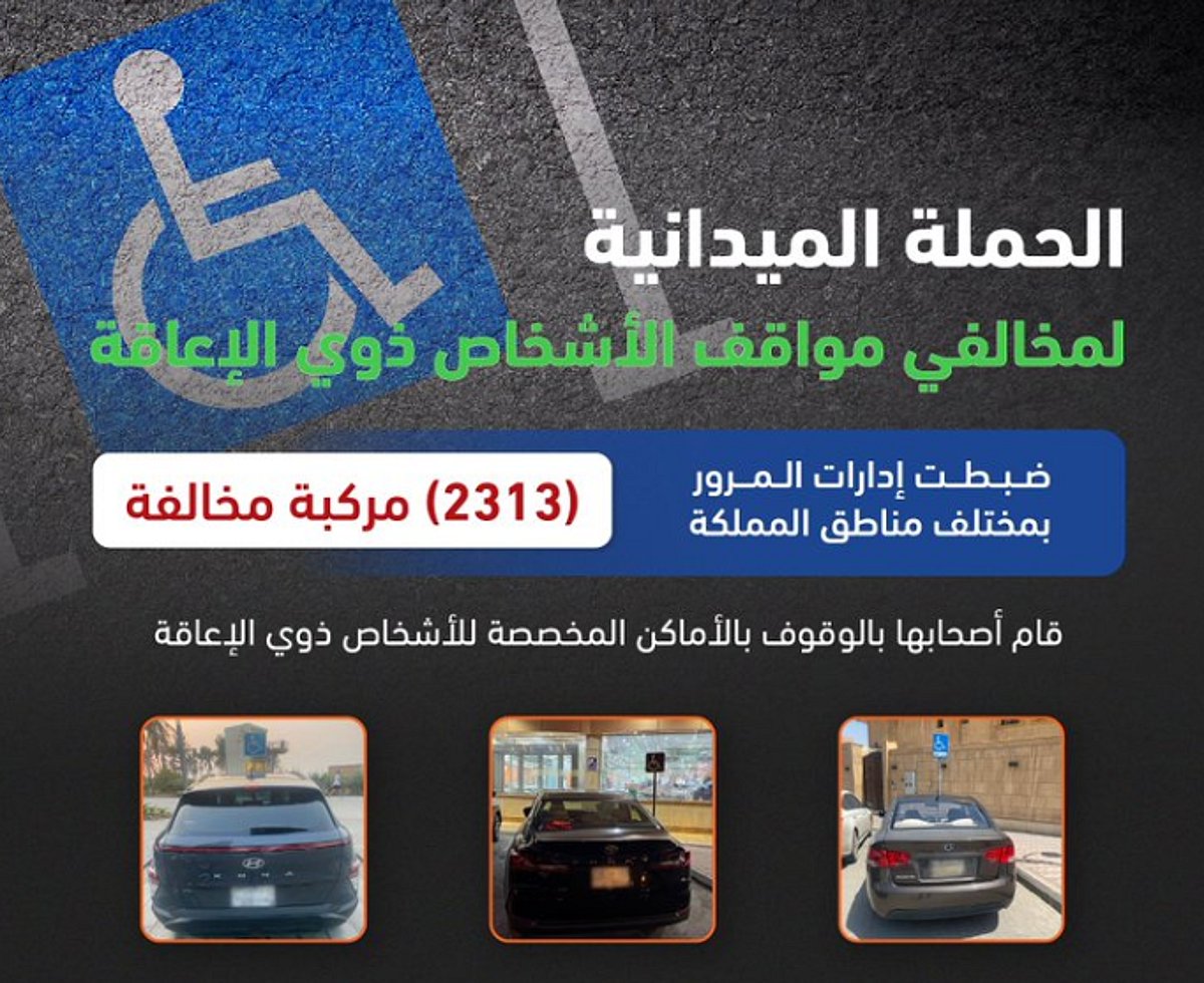وكشف «المرور السعودي» عبر حسابه بمنصة «إكس»، عن ضبط 2313 مركبة مخالفة، بمختلف مناطق المملكة، قام أصحابها بالوقوف بالأماكن المخصصة للأشخاص ذوي الإعاقة.