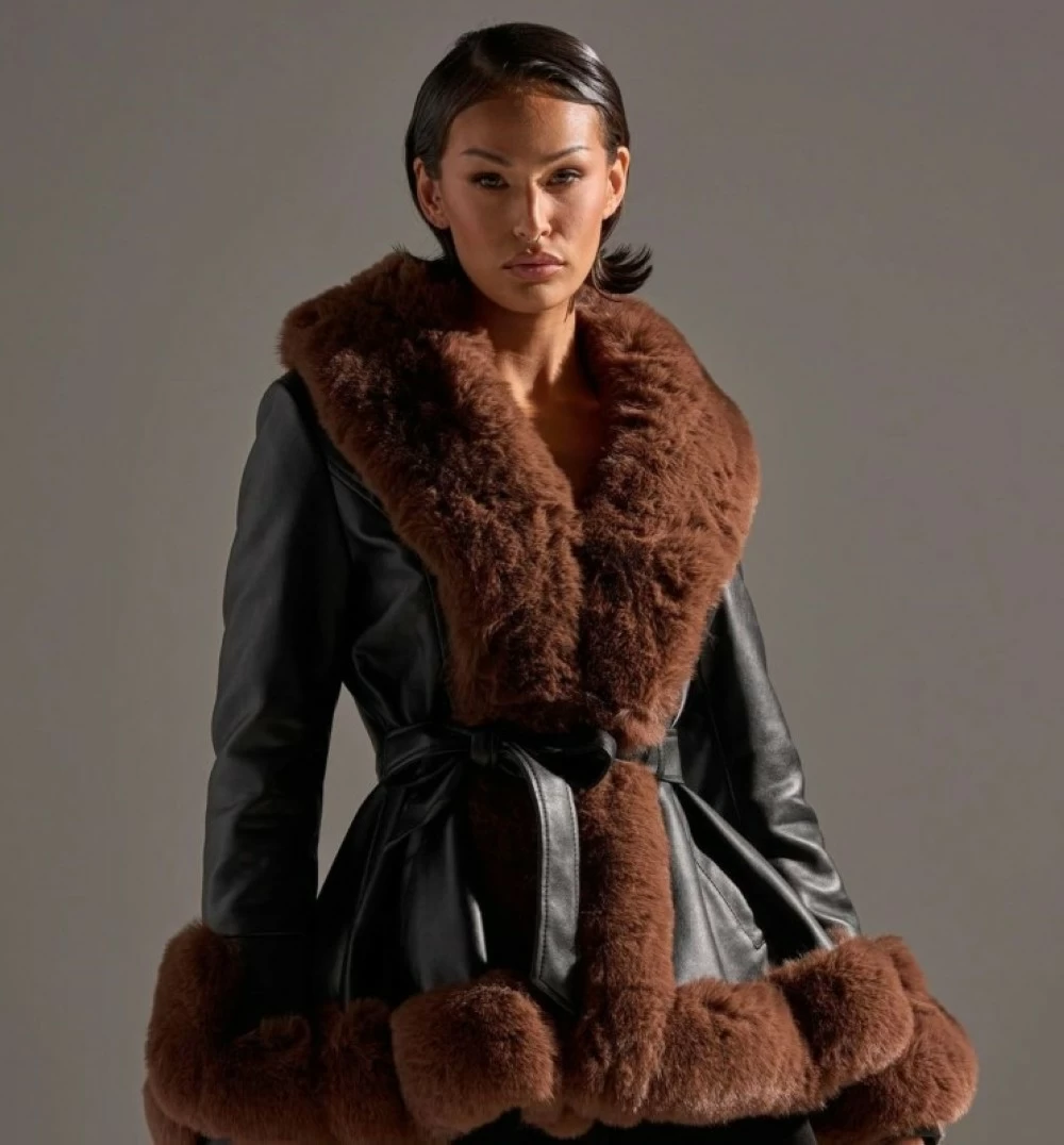 In the fur jacket, the peplum adds a sophisticated feminine touch, as it complements the shape of the jacket and gives it a modern and elegant character suitable for both formal and casual occasions.