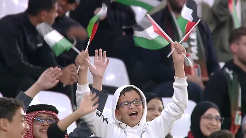 وتخلل الفعالية فقرة غنائية بروحٍ فلسطينية للفنانين ناصر الكبيسي ودانا المير ونسمة عماد وهالة العمادي لمقاطع من أغاني “زهرة المدائن” و”فلسطين عربية” و”موطني”، تفاعل معها الجماهير التي احتشدت في مدرجات ملعب المدينة للتضامن ودعم الشعب الفلسطيني.