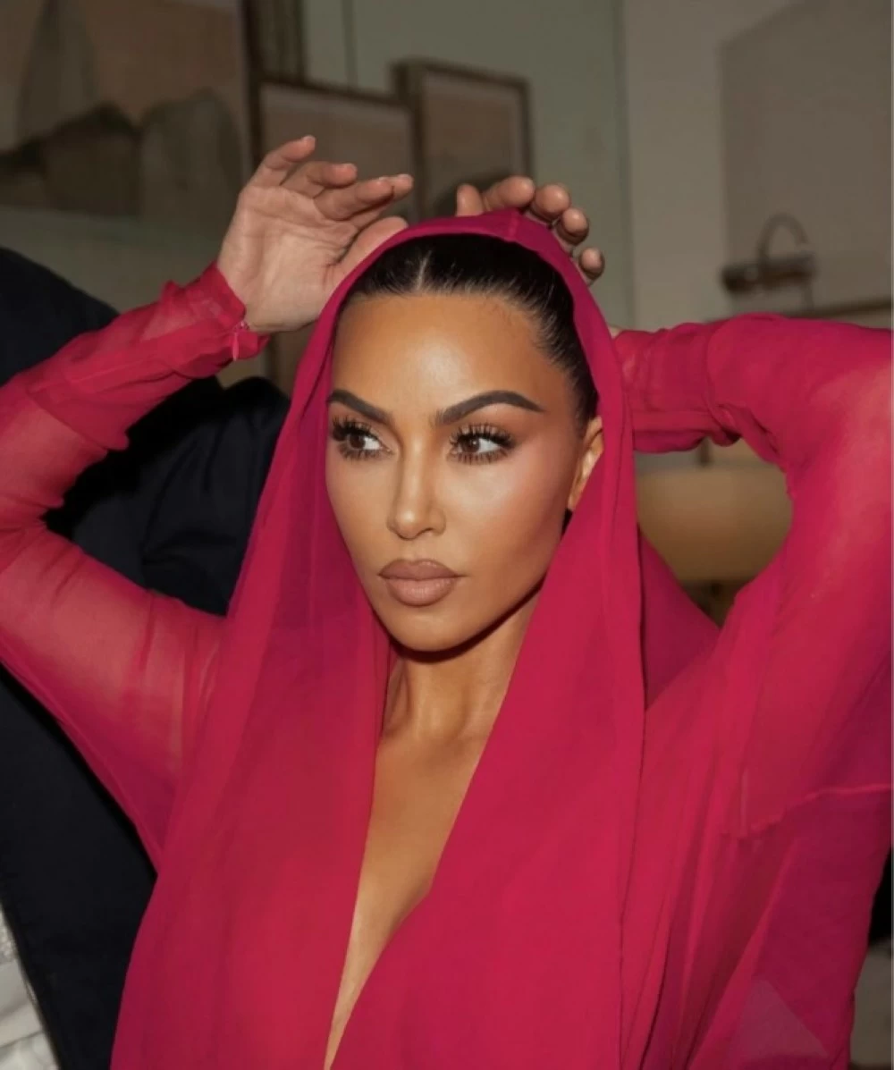 ظهرت كيم كارداشيان في منشور على إنستغرام بفستان فوشي شيفون شفاف، مصحوب بغطاء رأس (هود) من القماش نفسه، ما منحها مظهراً حالمياً ومترفاً في آن واحد. تصميم الفستان تميز بياقة درابية (cowl neck) ناعمة، ما أضفى لمسة درامية وأنثوية قوية. الأكمام كانت واسعة ومنفوخة، لتعزّز إحساس الانسيابية والحركة حين تتحرك أو تقف أمام الكاميرا.منسّقة الإطلالة مع صندل أبيض بسيط، ما خلق توازناً بين جرأة اللون الفوشي وخفة التفاصيل الأخرى. تسريحة شعرها مرفوعة تحت الغطاء، والمكياج كان ناعماً: عيون دخانية خفيفة، وشفاه بدرجة نيود، مع تحديد ملامح واضح لكن غير مبالغ فيه.الإطلالة تبدو مستوحاة من أسلوب «باربي المستقبلية»، وتعكس رغبة كيم في المزج بين الجرأة والرومانسية الفنية. كذلك، قد يكون اختيار الفوشي مرتبِطاً برسالة رمزية؛ فقد أُضيء تمثال المسيح المُخلّص في ريو دي جانيرو باللون الوردي في تلك الفترة، وربط بعض المحللين إطلالتها بهذا التصوّر، ما يعطي لمحة من التخطيط المتعمّد والتناسق البصري.