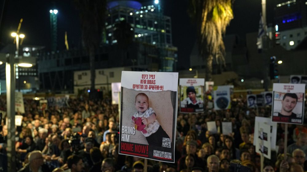 وظهرت الأسيرات اللواتي أطلق سراح معظمهن خلال الهدنة بين إسرائيل وحماس التي استمرت سبعة أيام في بث فيديو أمام حشد ضم الآلاف خلال مسيرة بوسط تل أبيب.