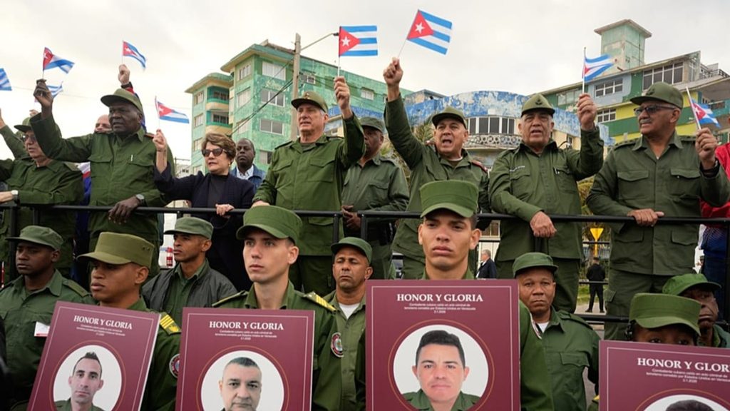 وقد تحولت التظاهرة إلى مسيرة أطلق عليها الكوبيون اسم “مسيرة المقاتلين”، وهو تقليد يعود إلى عهد الزعيم الراحل فيدل كاسترو. وتقدمت الحشود مجموعة من الأشخاص حملوا صور الضباط الـ32 الذين قُتلوا، فيما علت الهتافات: “تسقط الإمبريالية!” و”كوبا ستنتصر!”.