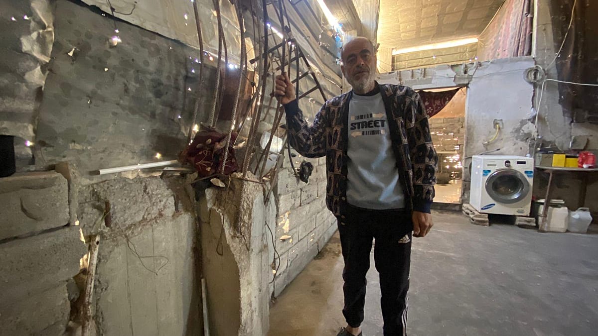 يقول أمجد: “كنا نعيش هنا عايشين مكيفيّن وصار دمار عنا، وشي بدل شي دبّرنا حالنا مع الحجار وزينكو وشوادر، أحسن من الخيمة يعني. بس البيت بدأ يقع، هذا عمود رايح وهذا عمود رايح، يعني قاعدين بخطر. بس شو بدنا نساوي، نروح الخيمة ولا نتمرمط في المدارس وأنا عندي صبايا وعيال؟ قلنا خلينا في الشقة وربنا يحمينا.”