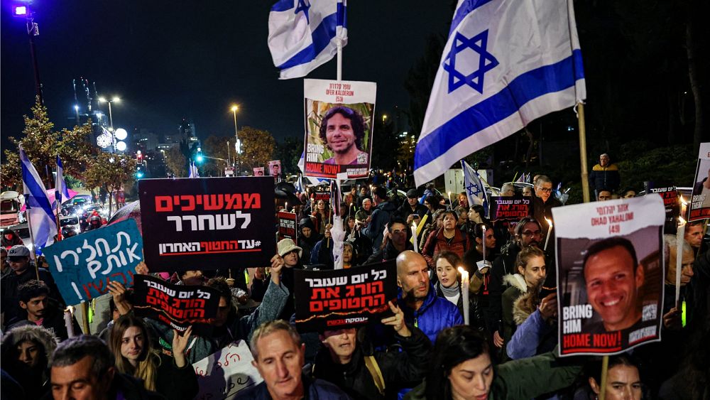 حمل المتظاهرون أمام الكنيست في القدس الغربية الشموع ولوحوا بالأعلام واللافتات عالياً، وهم يهتفون من أجل إطلاق سراح الأسرى المتبقين.