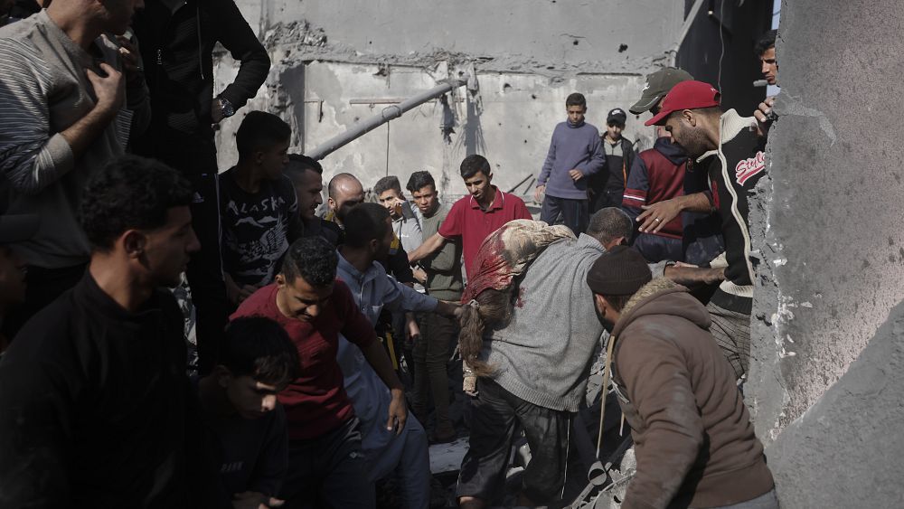 يقوم السكان في خان يونس في قطاع غزة بمحاولة البحث عن ناجين وانتشال جثث القتلى بعد غارة إسرائيلية استهدفت حيا سكنيا.
